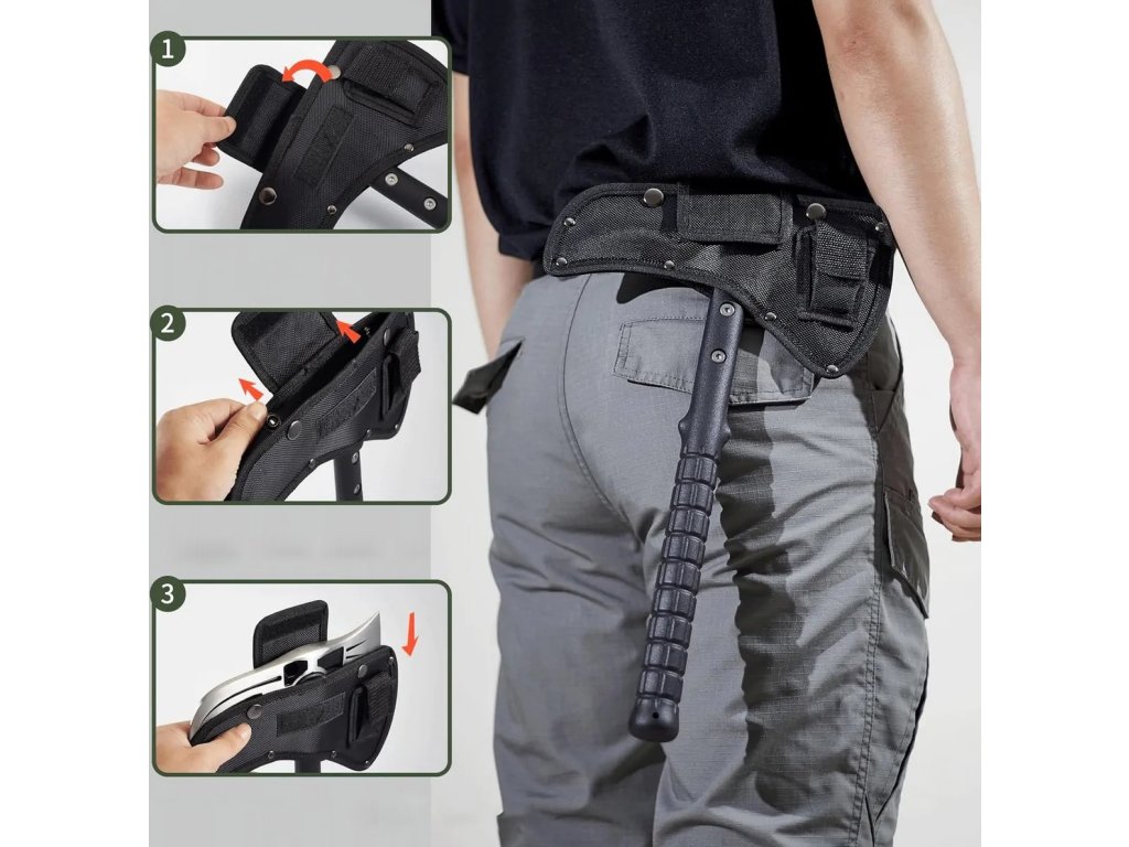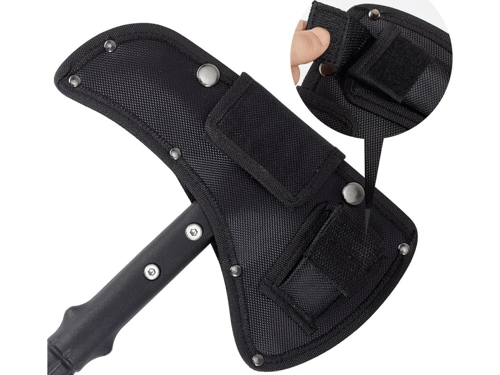 - Nylonové puzdro na hlavicu na bezpečné uloženie a prenášanie. Umožňuje pripevniť sekeru k batohu alebo ju zavesiť na opasok.