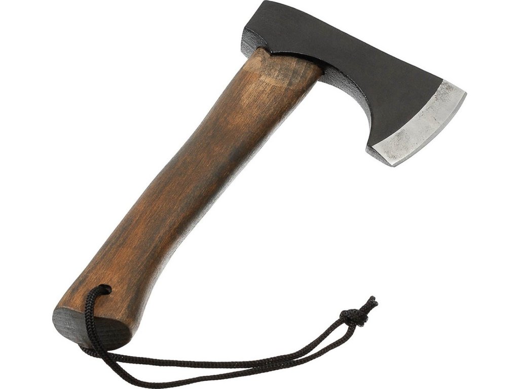 Vikingská sekera s drevenou násadou je praktická sekera na kempovanie, táborenie, survival, outdoor, zahradničení alebo bushcraft. Robustná oceľová hlava vedie presné údery, zatiaľ čo ergonomicky tvarovaná drevená násada bezpečne prenáša silu. Na konci rukoväte je očko so šnúrkou, ktoré je možné použiť na zavesenie sekery alebo na jej zaistenie pri práci. Nitované kožené puzdro s bezpečnostným remienkom chráni ostrie a umožňuje bezpečné nosenie v batohu alebo na opasku.