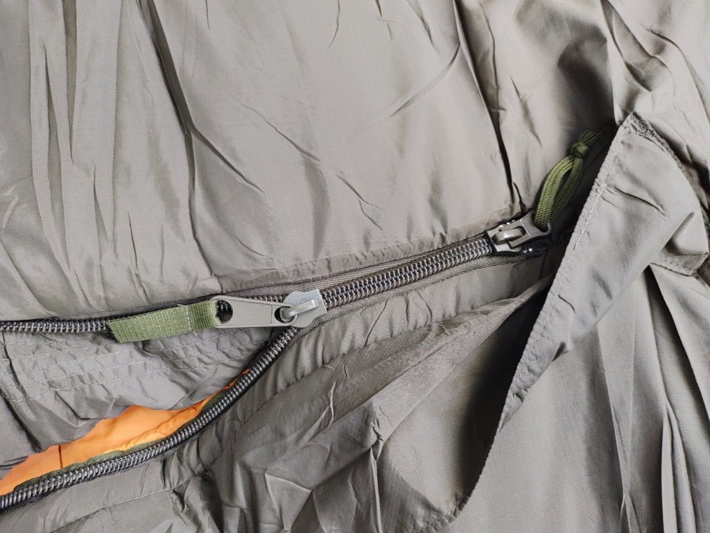 Zapínanie – uprostred horného dielu vreca je všité dvojcestné špirálové zips šírky (10 ±1) mm a dĺžky (1500 ±50) mm. Každý jazdec zipsu je opatrený ťahačom, ktorý napomáha komfortnejšej manipulácii. Zdrhovadlo je z hornej strany kryté chlopňou, (100 ±10) mm širokou hornou légou, zaistenou tromi stuhovými uzávermi s rozmermi (30 ±5) mm x (70 ±5) mm. Zo spodnej strany je zips prekrytý zateplenou (90 ±10) mm širokou légou. Spodná léga je niekoľkokrát pozdĺžne prešitá a na strane pri zipse je našité podloženie z popruhu. Zdrhovadlo je na oboch koncoch zaistené proti vytrhnutiu.