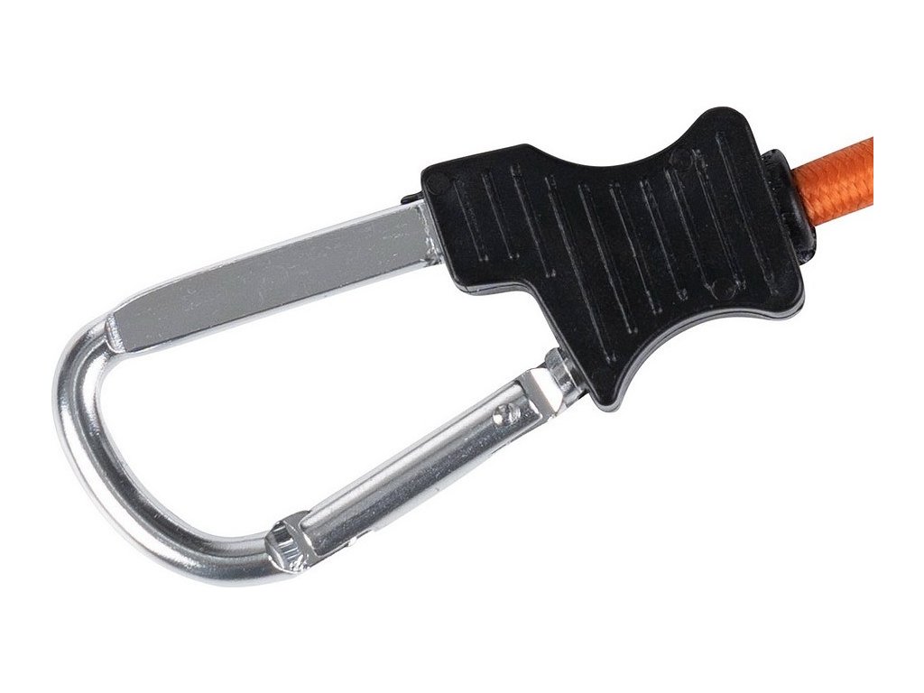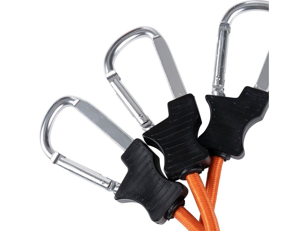 Silná guma ponúka flexibilitu a napätie, zatiaľ čo karabína zaisťuje bezpečné a ľahké upevnenie.