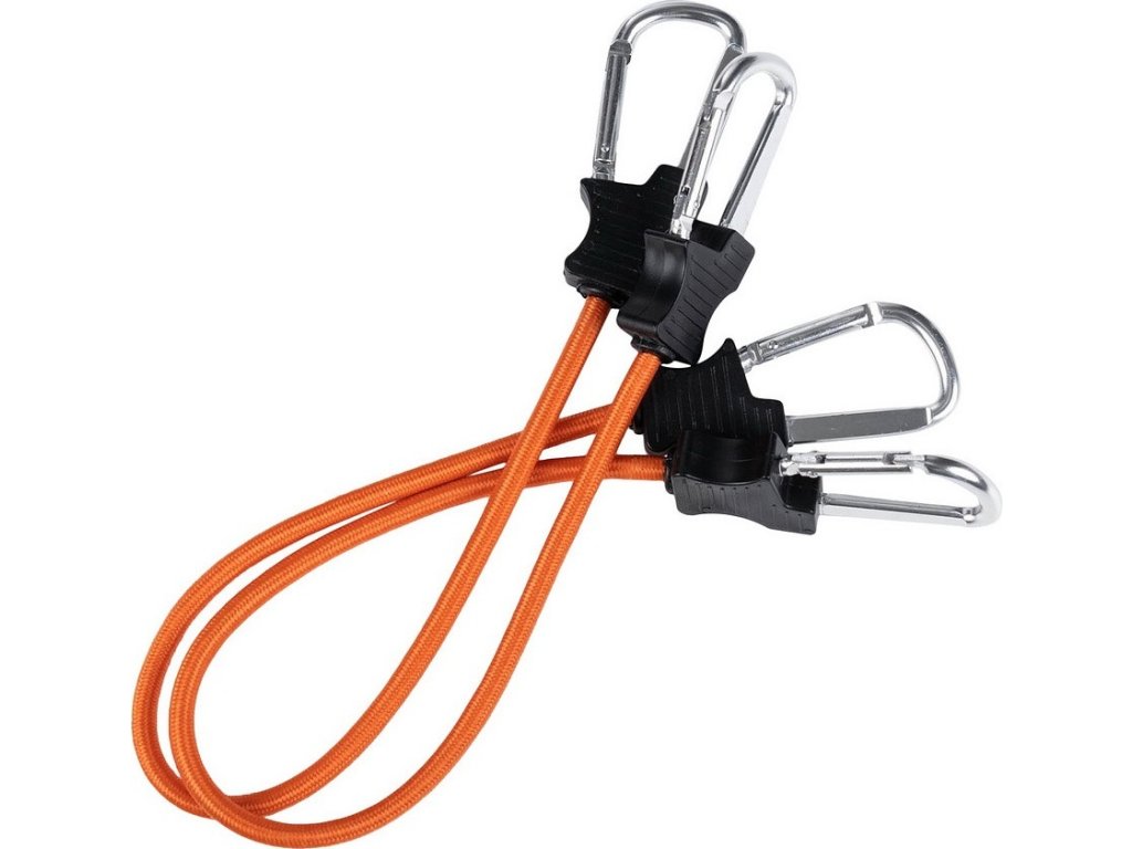 Tieto bungee šnúry sú vyrobené z elastického materiálu (gumové lano potiahnuté textíliou) a na oboch koncoch majú kovové karabíny, ktoré zostávajú pripevnené bez ohľadu na napätie.