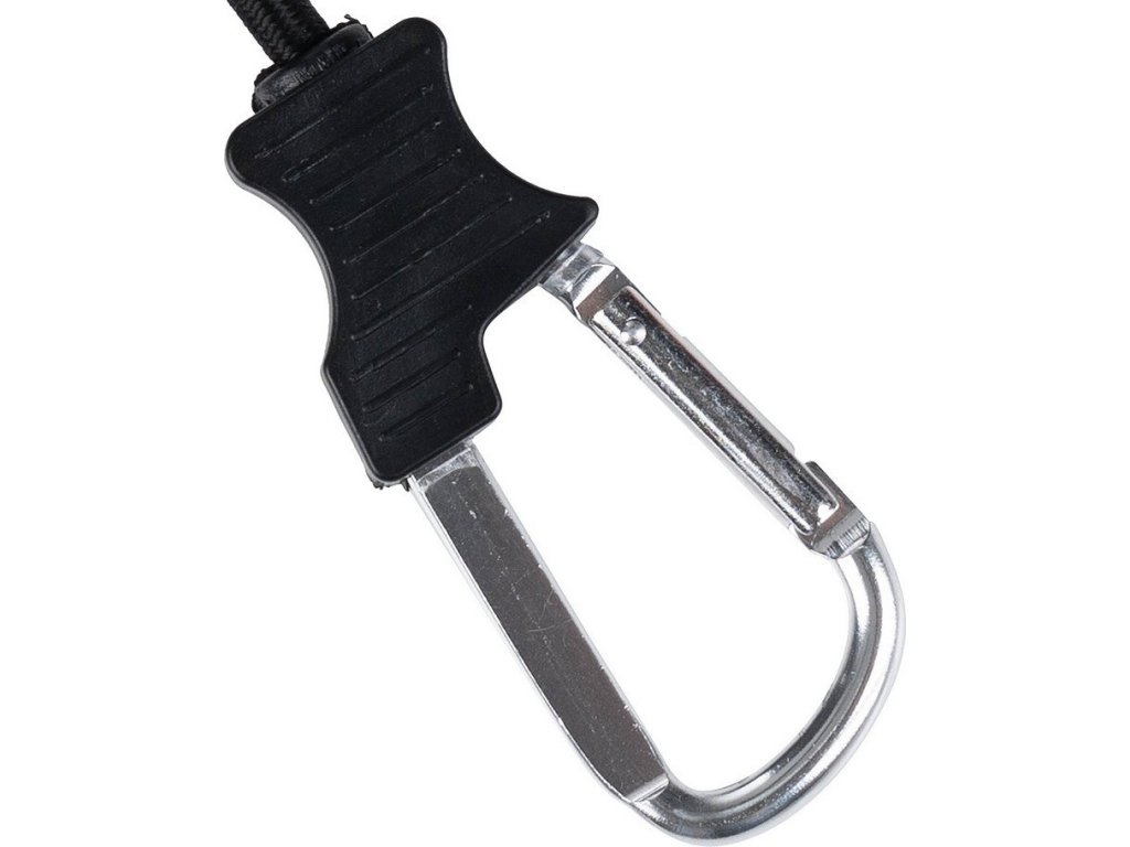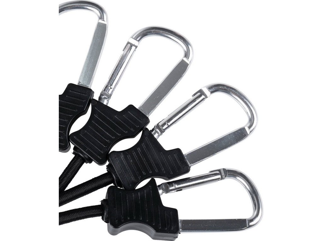 Silná guma ponúka flexibilitu a napätie, zatiaľ čo karabína zaisťuje bezpečné a ľahké upevnenie.
