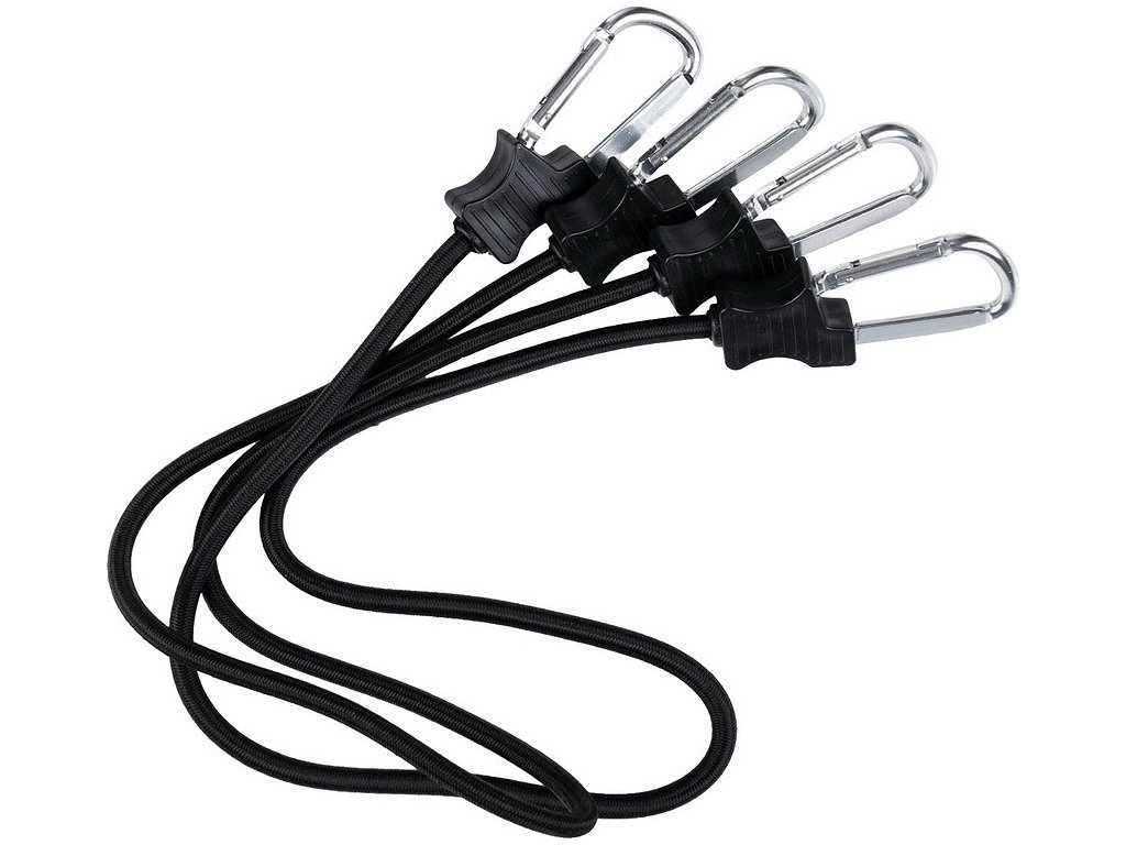 Tieto bungee šnúry sú vyrobené z elastického materiálu (gumové lano potiahnuté textíliou) a na oboch koncoch majú kovové karabíny, ktoré zostávajú pripevnené bez ohľadu na napätie.