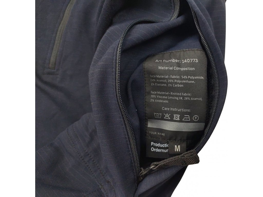 - Torzo tričká je z vysoko elastickej, priedušnej a odolnej zmesi z meta-aramidového vlákna, viskózy spomaľujúcej horenie, elastanu a antistatického vlákna.