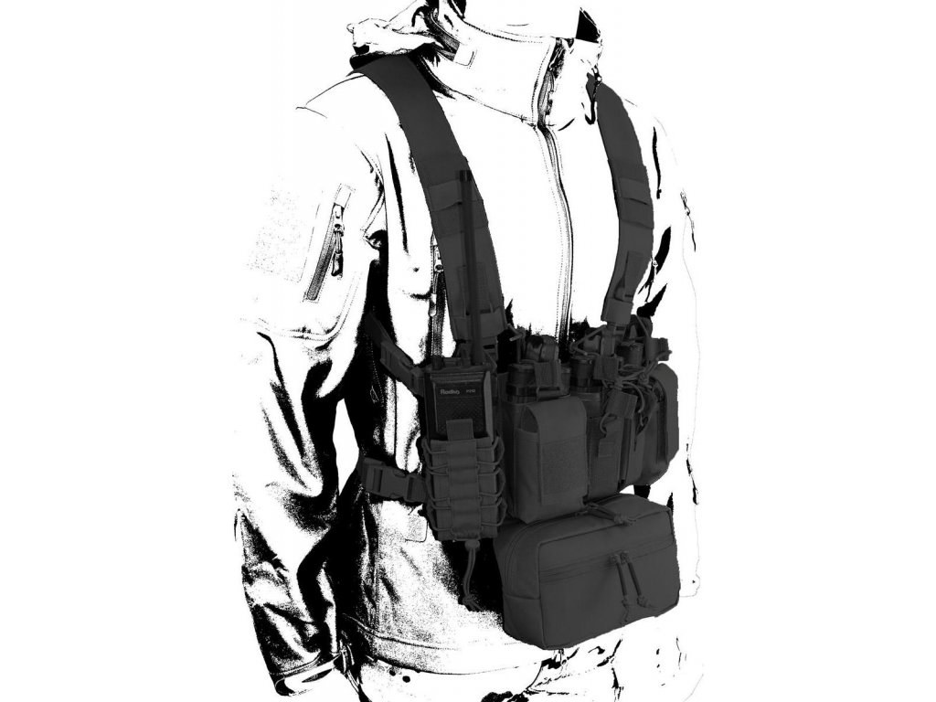 Moderní taktické vybavení pro aktivní střelce. Vyrobeno z vysoce kvalitního materiálu Cordura® 500D, který se vyznačuje vysokou odolností proti mechanickému poškození a díky PU úpravě, odolnosti vůči sněhu a vodě. Tato víceúčelová hrudní souprava se používá k uložení munice, zásobníků a dalších důležitých věcí. Je vybavena klokaní kapsou která obsahuje elastické proužky pro uložení vybavení. Nastavitelné polstrované ramenní popruhy a nastavitelný zadní popruh X umožňuje, aby se Chest Rig přizpůsobil jakékoli velikosti.