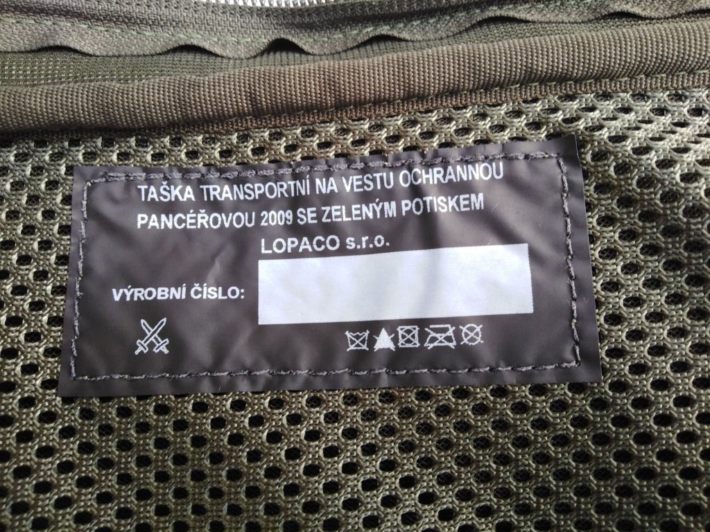 - Oficiálny názov: "Taška transportná na vestu ochrannú pancierovú 2009 so zelenou potlačou"