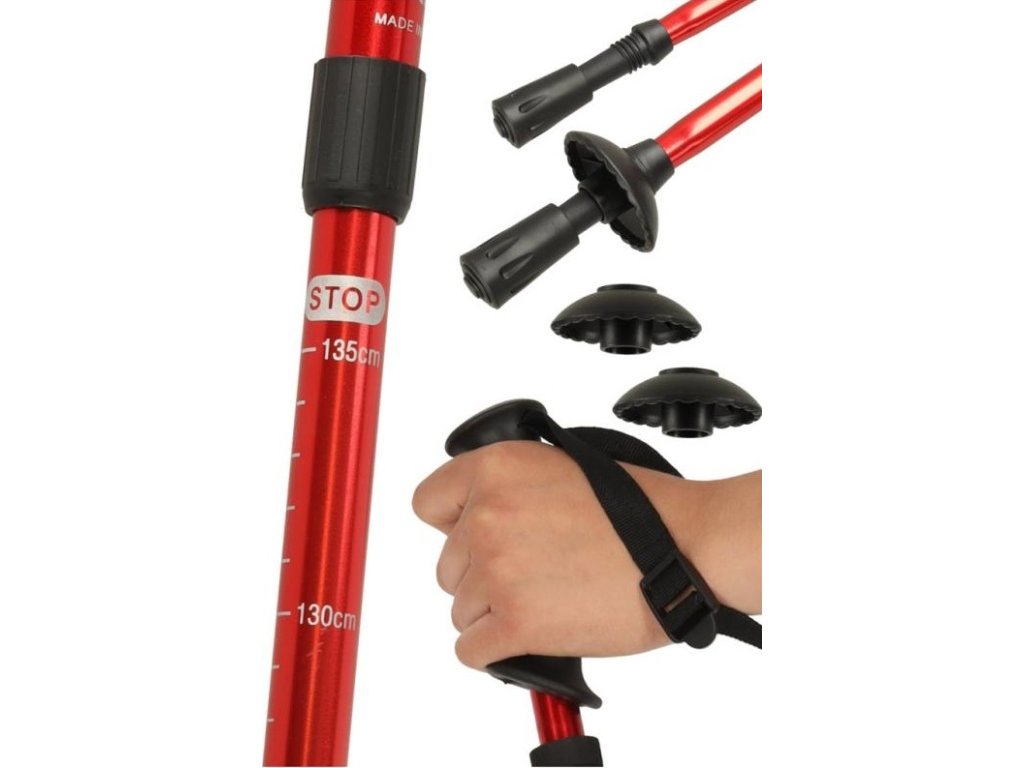 - Rozkladací a skladací mechanizmus umožňuje plynulé nastavenie palíc od 63 cm do 135 cm, takže ich je možné individuálne prispôsobiť výške užívateľa.