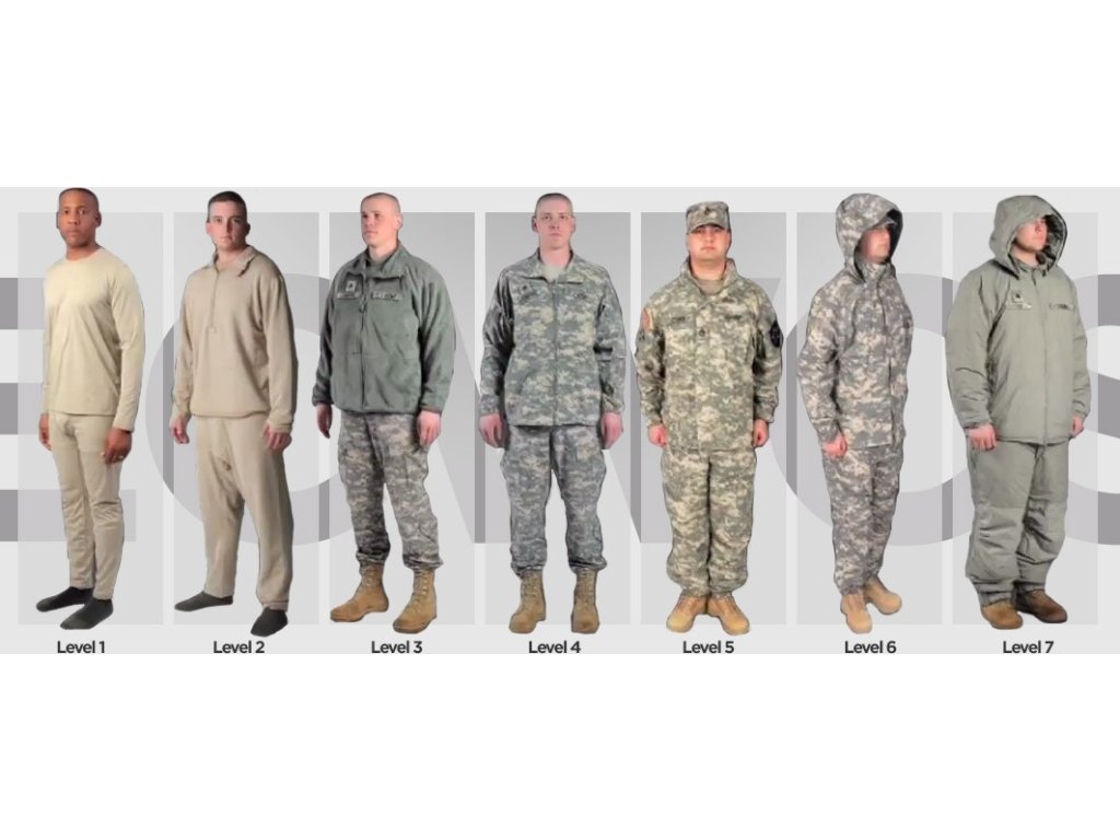 - Level VII: Extreme Cold Weather soft shell s PrimaLoft Silver Insulation USA Parka & Trousers (Mäkká škrupina pre extrémne chladné počasie so striebornou izoláciou PrimaLoft USA Parka a nohavice).
