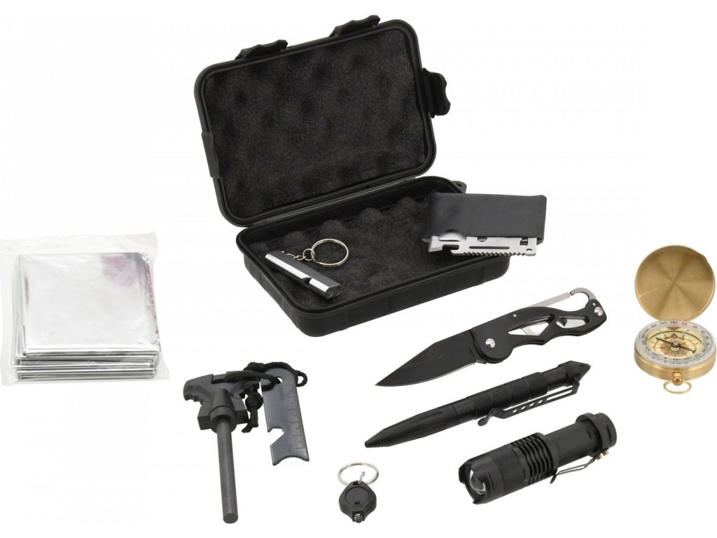 SOS sada je zložená zo zatváracieho noža s čepeľou dĺžky 6,5 cm, multifunkčné karty, píšťalky, kompasu s otočnou stupnicou, bivakovacej (izotermickej) fólie, rozmerného kresadla pre zapálenie ohňa, príveskom s LED osvetlením a celokovovým perom s prierazným (ceružková batéria nie je súčasťou balenia) s nastaviteľným kužeľom vysoko výkonného svetla. Všetko je uložené v ochrannom, uzatvárateľnom púzdre.