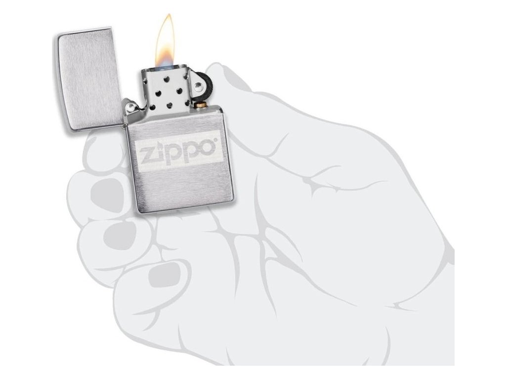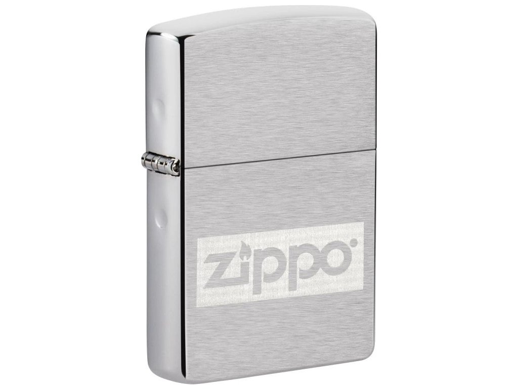 - Benzínový zapaľovač Zippo s povrchom z brúseného chrómu s leptaným logom.