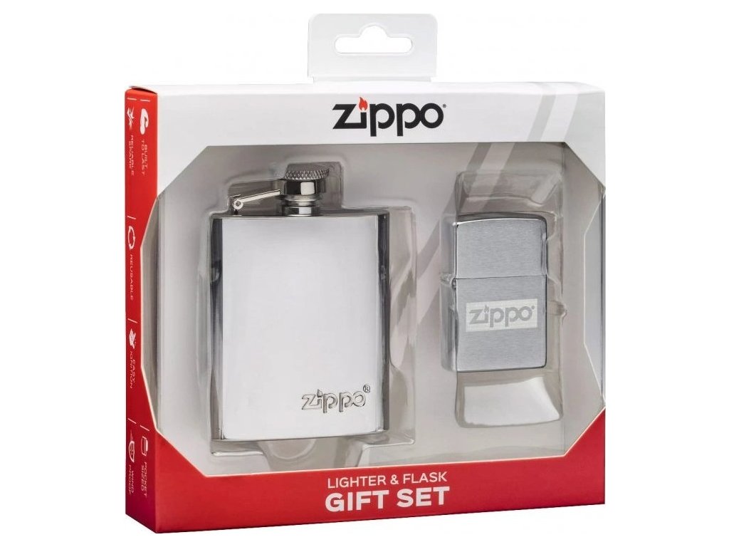 Darčeková sada Zippo® obsahuje ikonický benzínový zapaľovač Zippo a kovovú likérku – ploskačku s objemom 90 ml. Jedná sa o elegantnú a praktickú kombináciu, ktorá poteší každého fanúšika značky Zippo, milovníka štýlových doplnkov aj zberateľov.